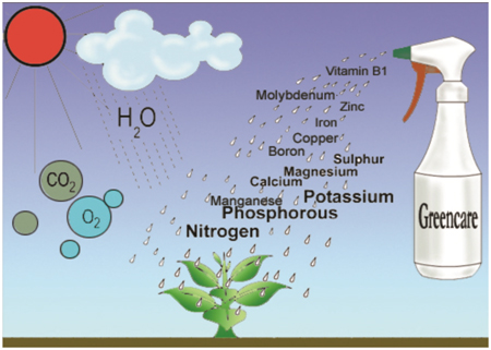 The below depiction shows the essential nutrients that the plant requires for a healthy life and how they can be made available to plants through foliar application. The requirement of Oxygen, Carbon and Hydrogen are available in nature. Other elements like Primary (N.P.K), Secondary (Ca, Mg & S) and Micronutrients (B, Cu, Mn, Fe, Mo, Zn, Cl etc. are to be provided through application of approved ingredients in the soluble form.